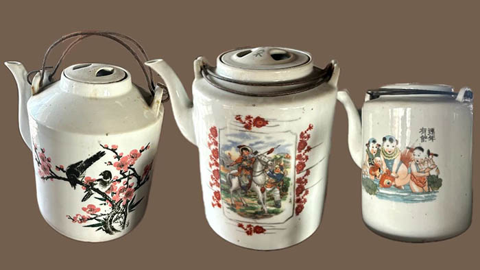 家中藏壺以民清瓷壺為最,大小形制各異:大者尺余,昔年用于泡制涼茶;小者盈握,當屬文人雅士案頭清供。壺身繪事尤為精妙,或山水空蒙,或福祿壽喜,或英雄豪杰,一筆一畫間,盡是匠人心思,更見歲月留痕。