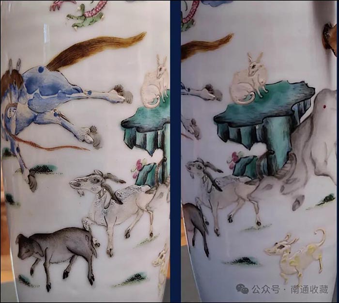 瓷尊高21厘米,口徑6.5厘米,整體釉面潔白純凈,胎質細膩堅致,彩繪鮮亮,層次豐富。十二生肖紋的畫風具有中國年畫的風格,整個畫面歡快又靈性。
