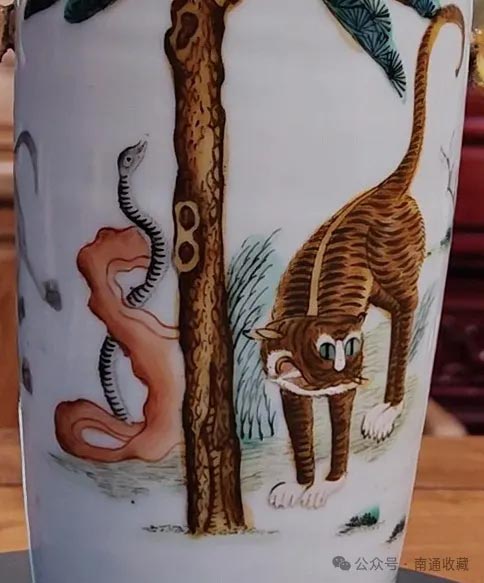 畫面中參雜的些許童趣,又讓畫面顯得親和與活躍。蛇與虎隔在松樹樹桿兩側,老虎童話式的“王”字臉顯得格外的親和;蛇沿著假山石向上攀爬,沒有“一朝被蛇咬,十年怕井繩”的恐懼感。