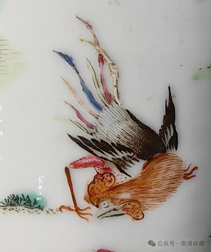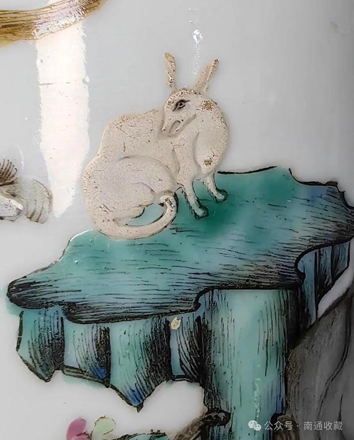 迷底就在于圈足中的三行六字,“大清乾隆年制”礬紅款,此尊為乾隆本朝出品,畫師很有經驗,不想給自己帶來麻煩,在繪畫時把兔子的尾巴加長。因為乾隆屬兔,該避忌的,還是要避忌,畫短了就會陷入“兔子尾巴長不了”之坑,惹上殺身之禍。